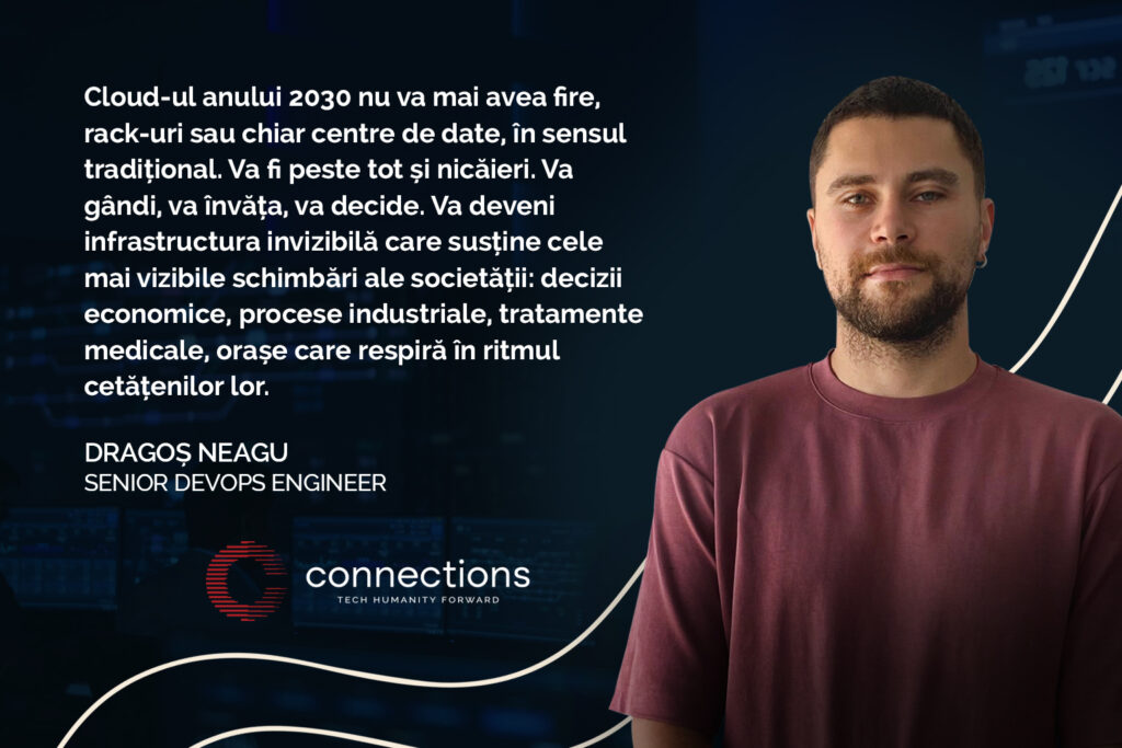 “Cloud-ul anului 2030 nu va mai avea fire, rack-uri sau chiar centre de date, în sensul tradițional. Va fi peste tot și nicăieri. Va gândi, va învăța, va decide. Va deveni infrastructura invizibilă care susține cele mai vizibile schimbări ale societății: decizii economice, procese industriale, tratamente medicale, orașe care respiră în ritmul cetățenilor lor” – Dragoș Neagu, Senior DevOps Engineer