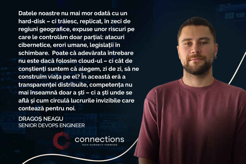 Oricât de important, prezent și necesar este cloud-ul în viața de zi cu zi, Dragoș Neagu, Senior DevOps Engineer la Connections, ne amintește că odată cu această libertate vine și o nouă formă de fragilitate: “Datele noastre nu mai mor odată cu un hard-disk – ci trăiesc, replicat, în zeci de regiuni geografice, expuse unor riscuri pe care le controlăm doar parțial: atacuri cibernetice, erori umane, legislații în schimbare.